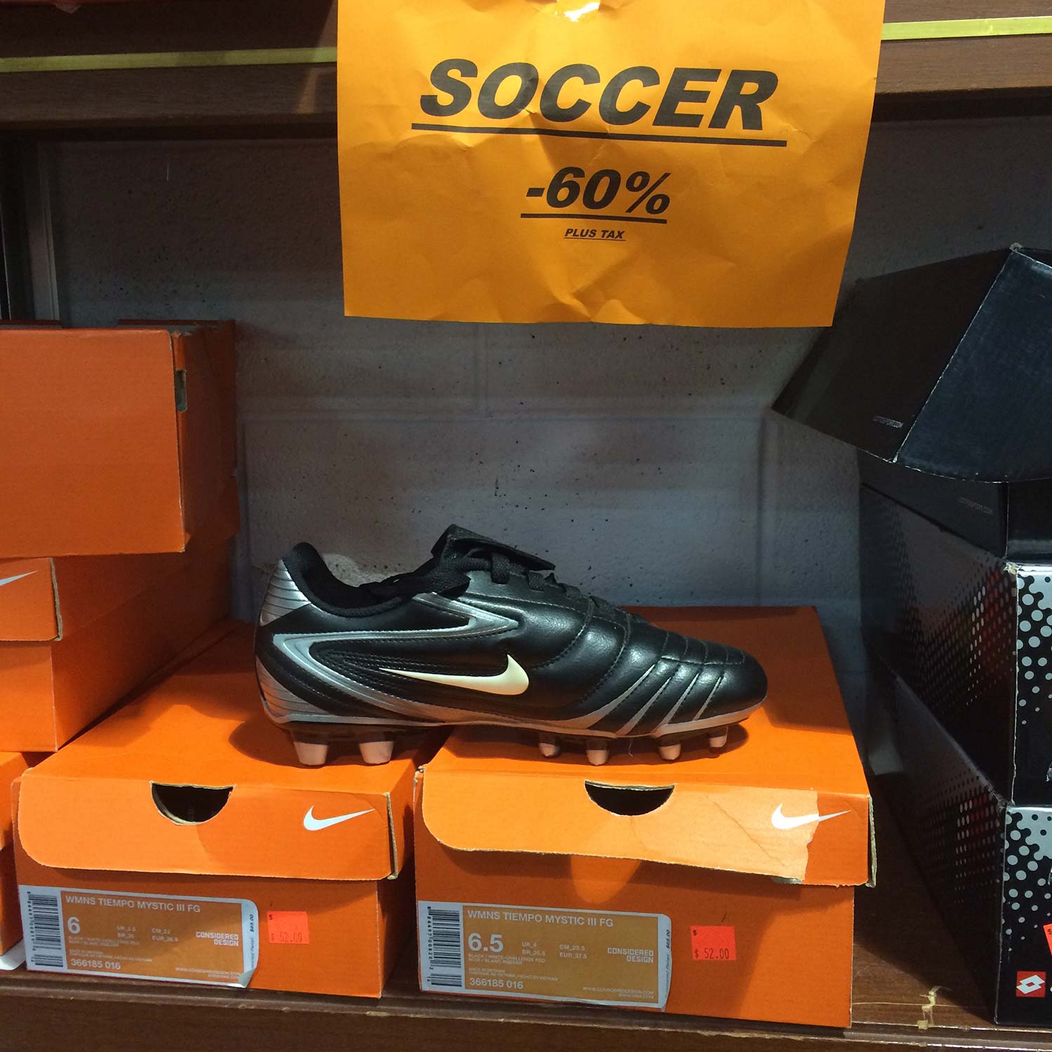 If that’s not reason enough to pass by…They have CLEATS! Yes – those shoes that we overpay for so that our kids can slip & slide in the mud for a SOCCER season and not ever wear again…those cleats. When I was there I spotted this pair of Nikes for $20.80 +tax! Yes, the price tag says $52, but all the cleats are 60% off the ticketed price! It’s good to note that they also have Puma, Adidas, Diadora & Lotto, but given the season, they are running out quickly and there are limited quantities available. Of note: They have cleats for ADULTS as well 🙂