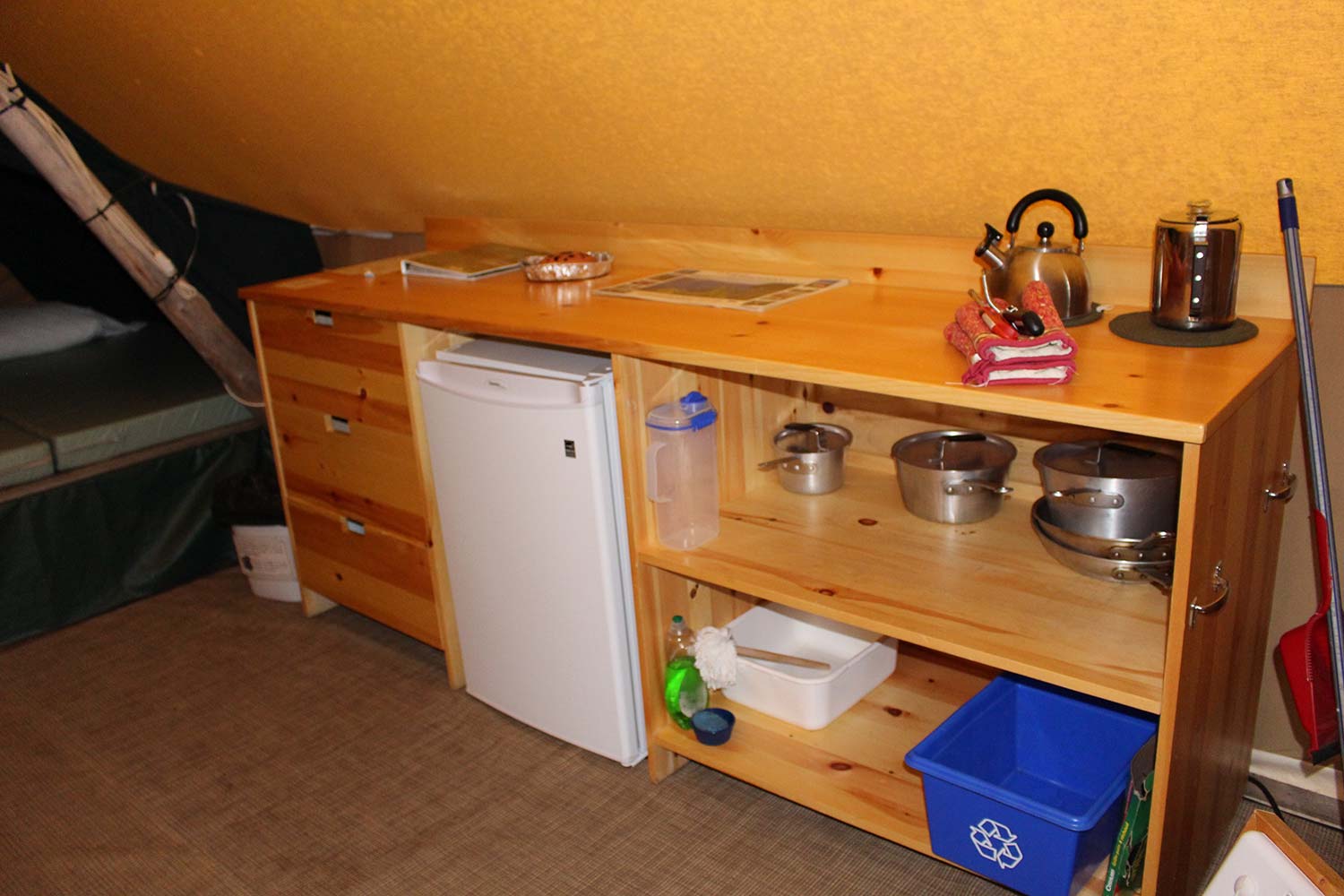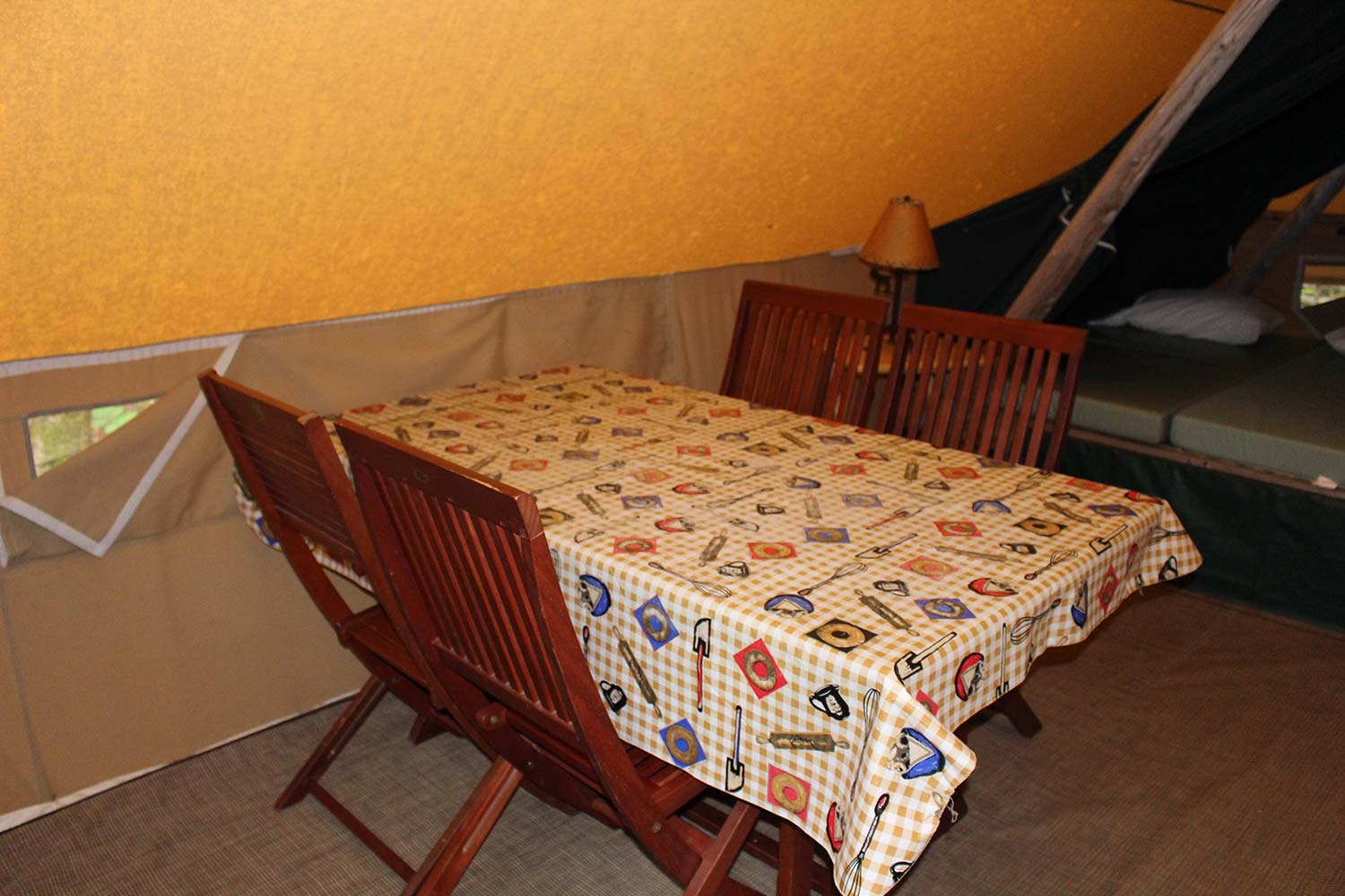 Our “Glamping” accommodations consisted of a Huttopia: A pre-set-up tent on a raised platform, with beds that fit all 6 of us, electricity, lighting, a mini-fridge, heating and a kitchen table & chairs inside the unit. All dishes, cookware & flatware were provided, as well as dish soap, dishpan & a sponge.