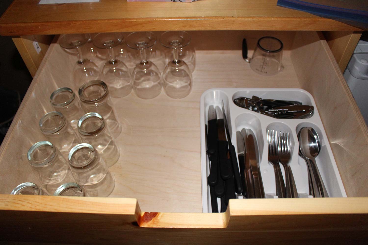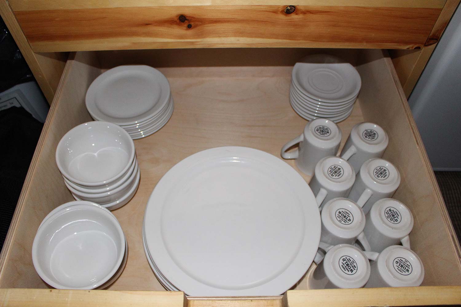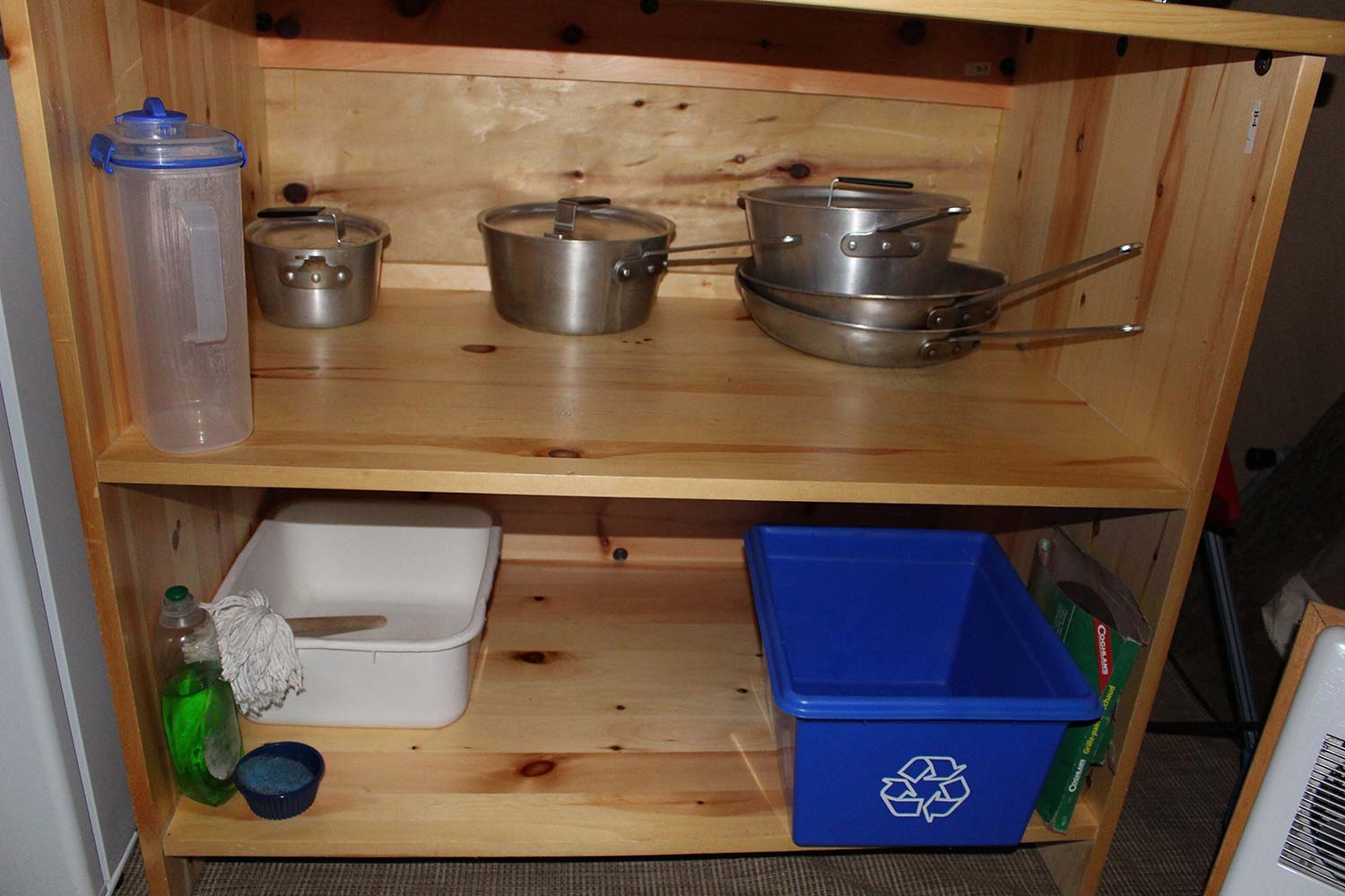 - multiple plastic bins filled with pots & pans, dishes, flatware & utensils, flashlights, hotplates, clothesline & clothespins…