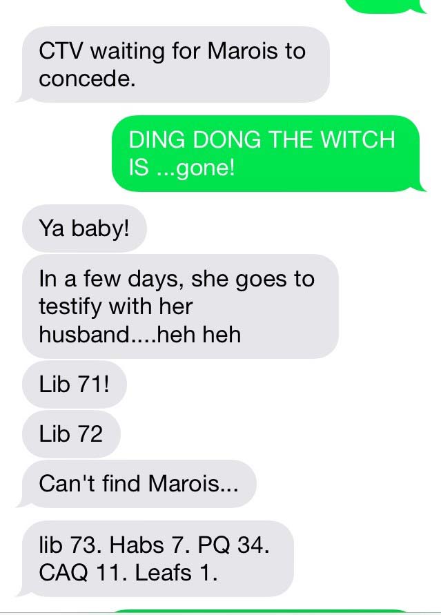I couldn’t help but notice how many of us felt the need to break into the Wizard of Oz “Ding Dong the witch is ….GONE!”, like I did in this awesome text message between my hubby & I last night (yes, I was at a meeting!)